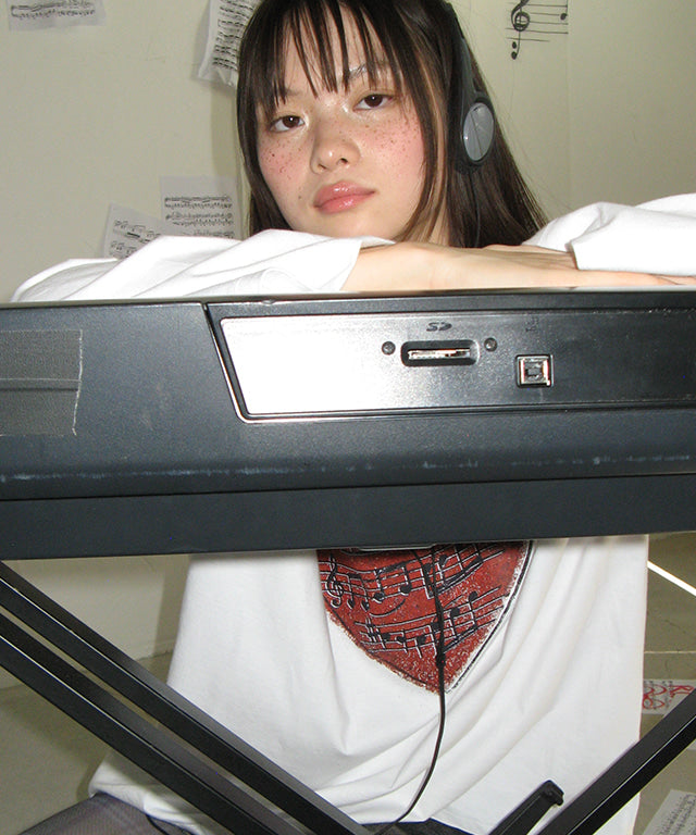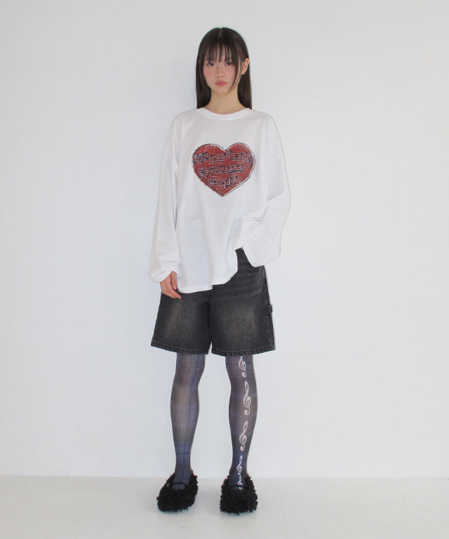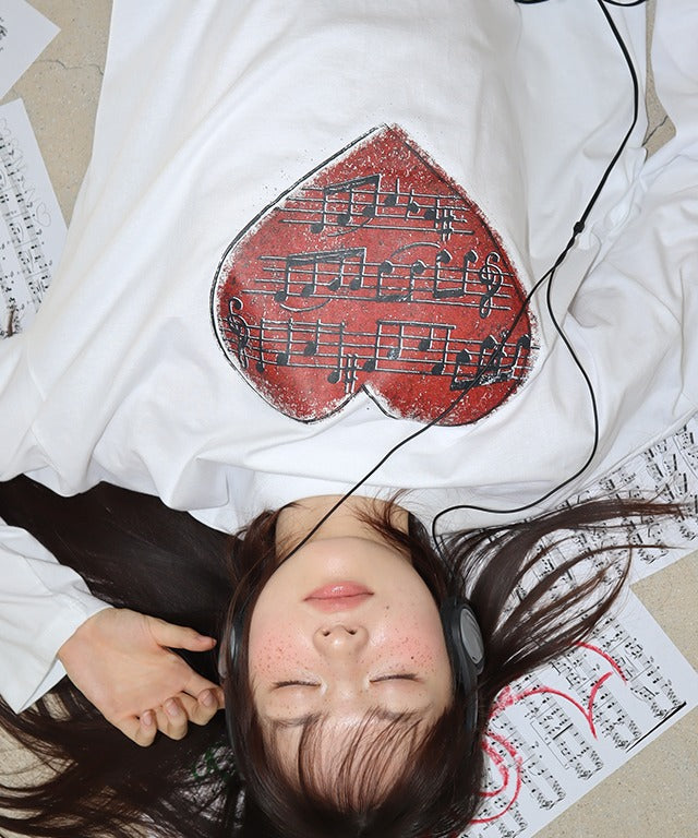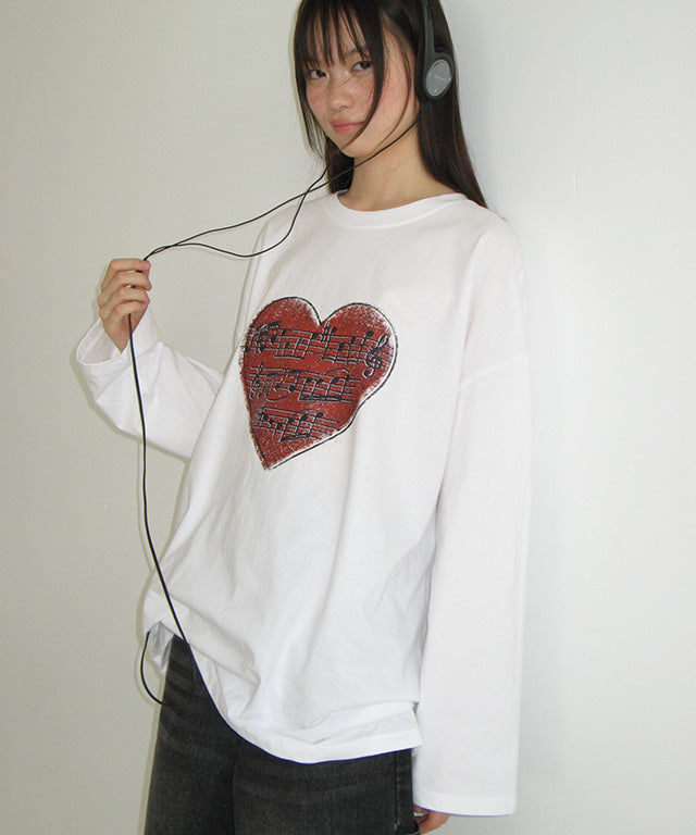 RONRON VINTAGE HEART MUSIC OVER FIT LONG SLEEVE WHITE