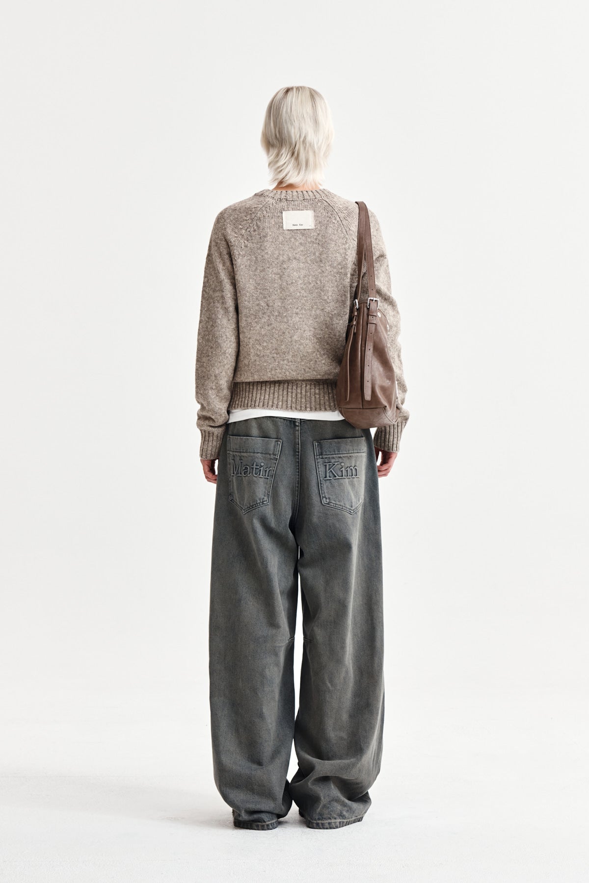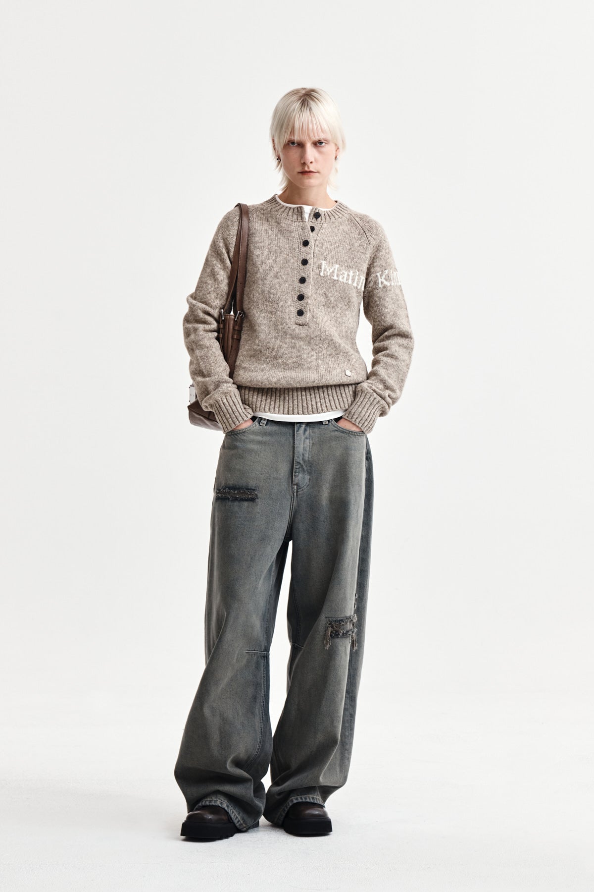 MATIN KIM BUTTON POINT HENLY NECK LOGO KNIT TOP IN BEIGE
