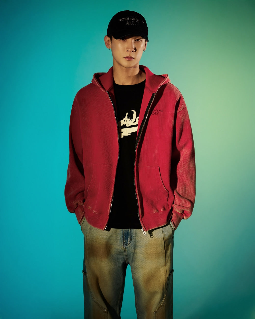 Add ADLV BASIC LOGO WAFFLE WASHED HOODIE ZIP UP RED to the cart