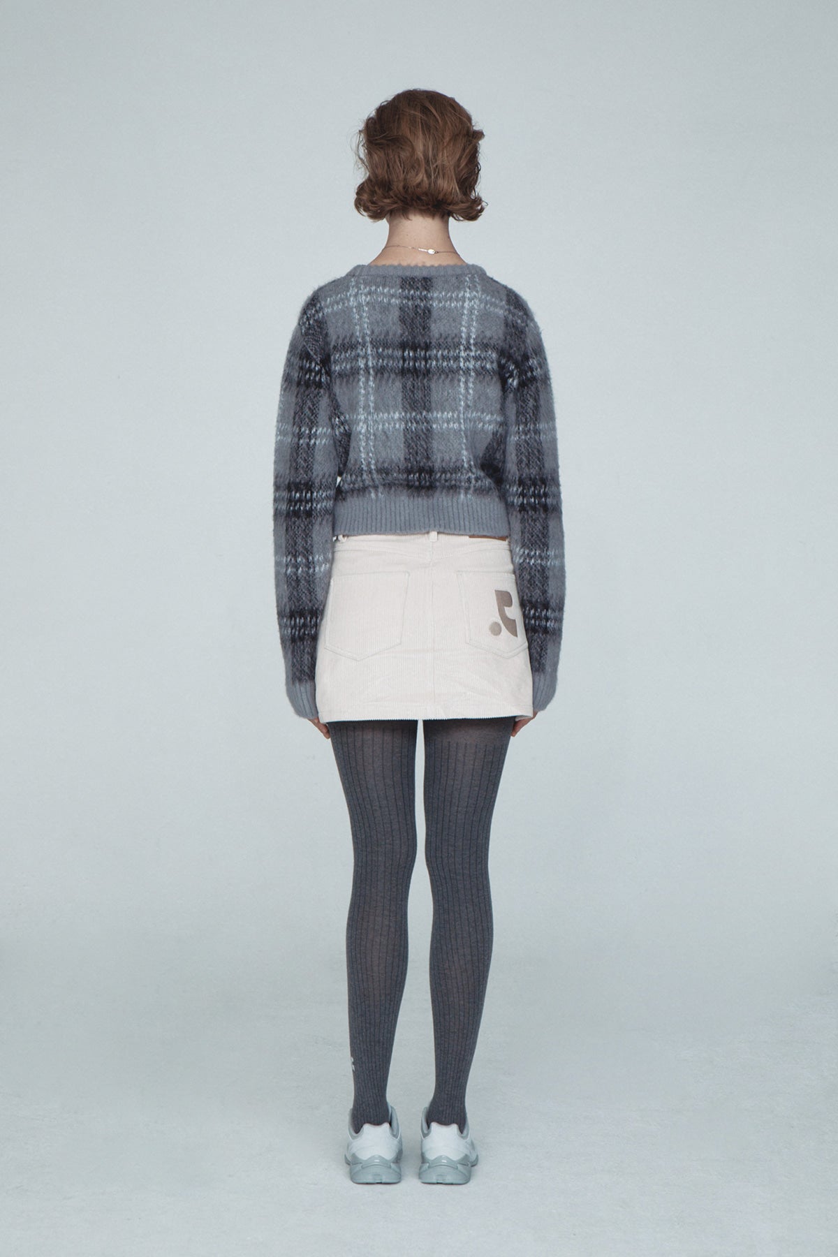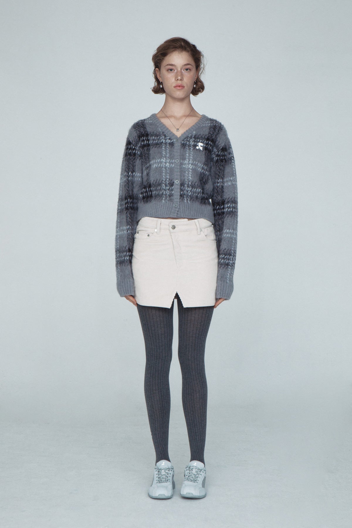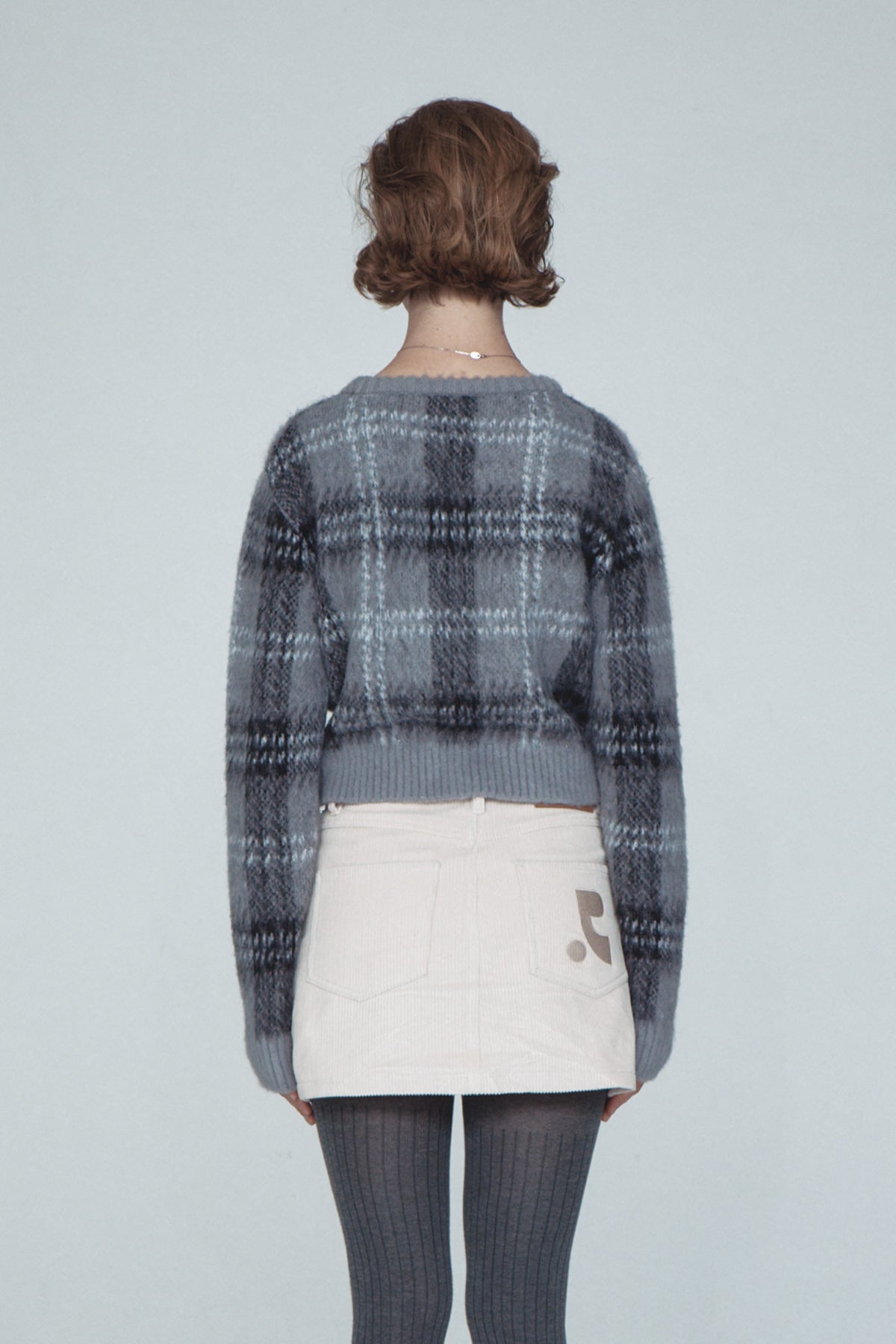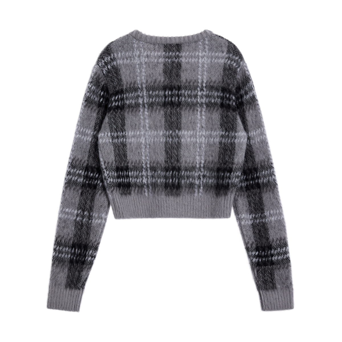 CHECK PATTERN HAIRY KNIT CARDIGAN - GREY