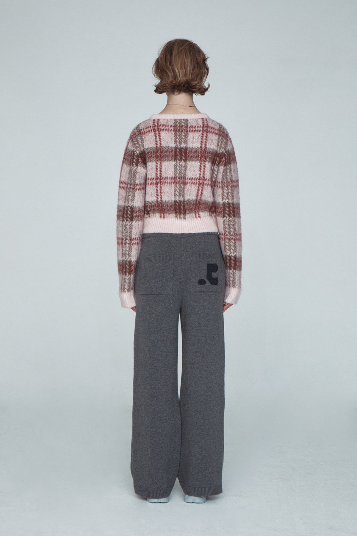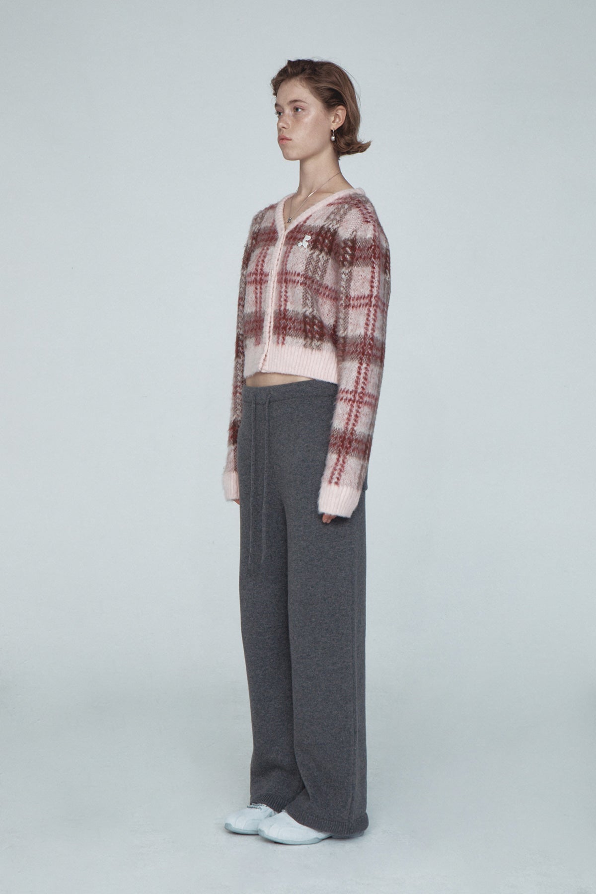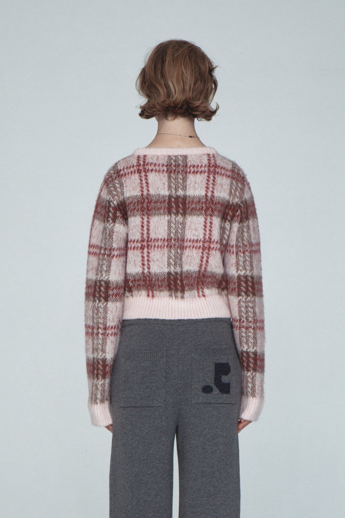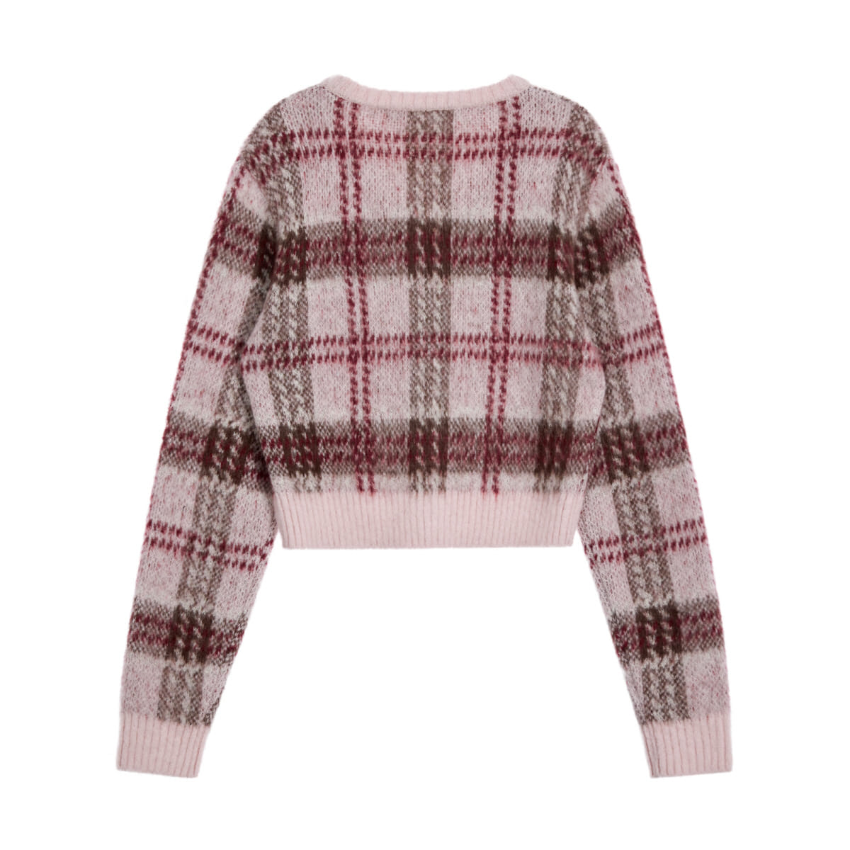 CHECK PATTERN HAIRY KNIT CARDIGAN - PINK