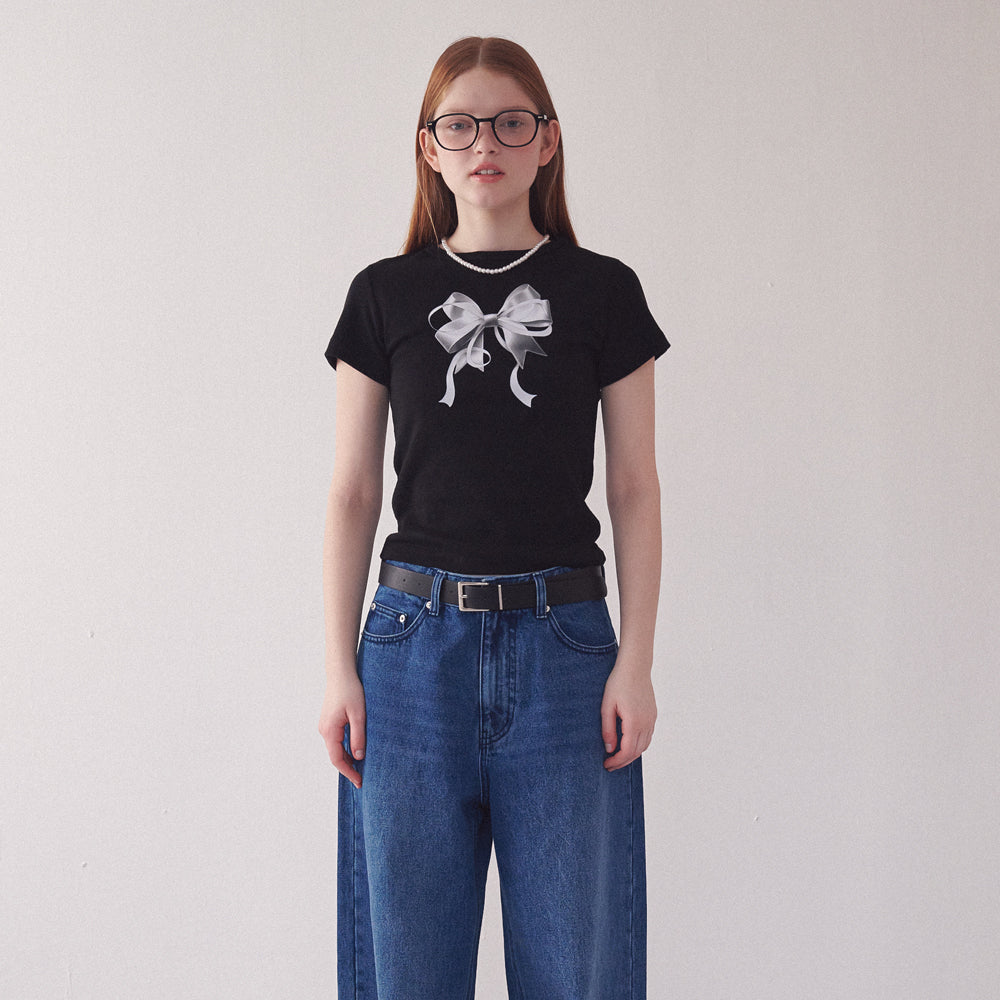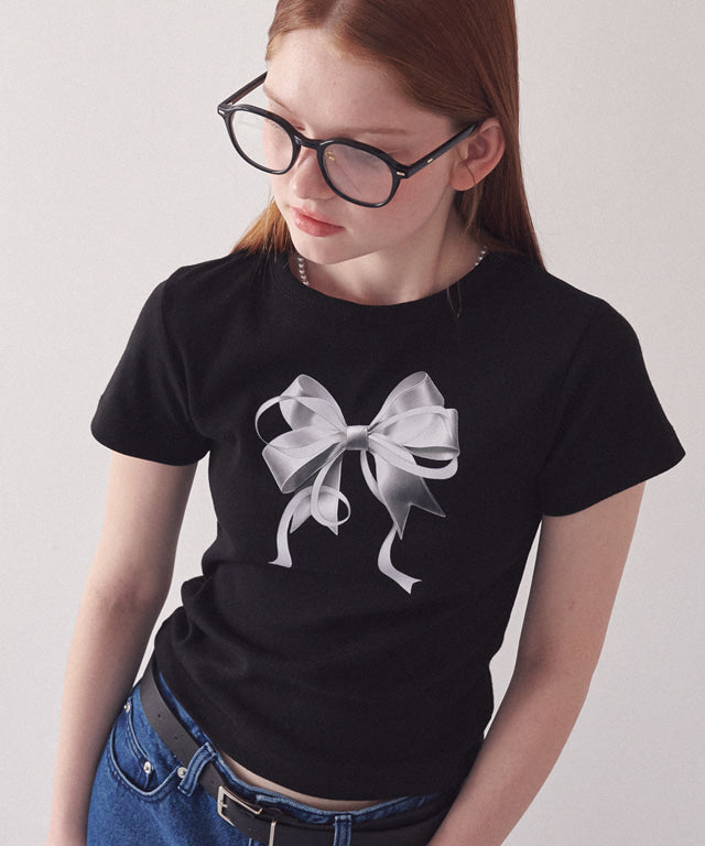 Add RONRON DOUBLE RIBBON SLIM CROP T SHIRT BLACK SILVER to the cart