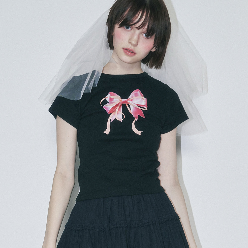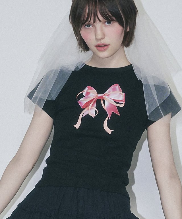 Add RONRON DOUBLE RIBBON SLIM CROP T SHIRT BLACK PINK to the cart