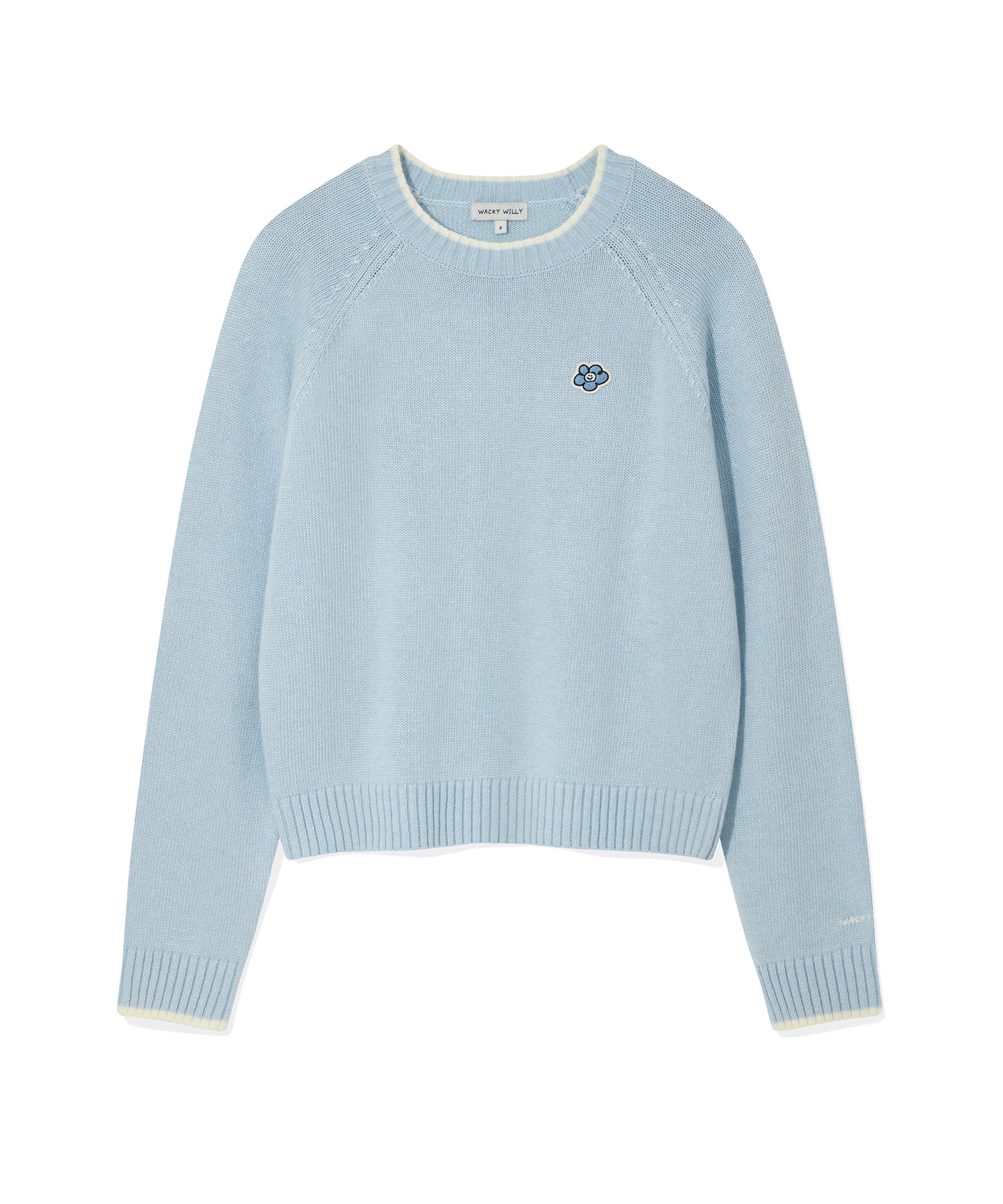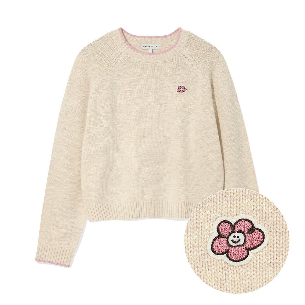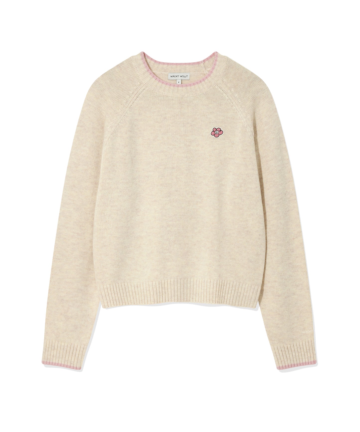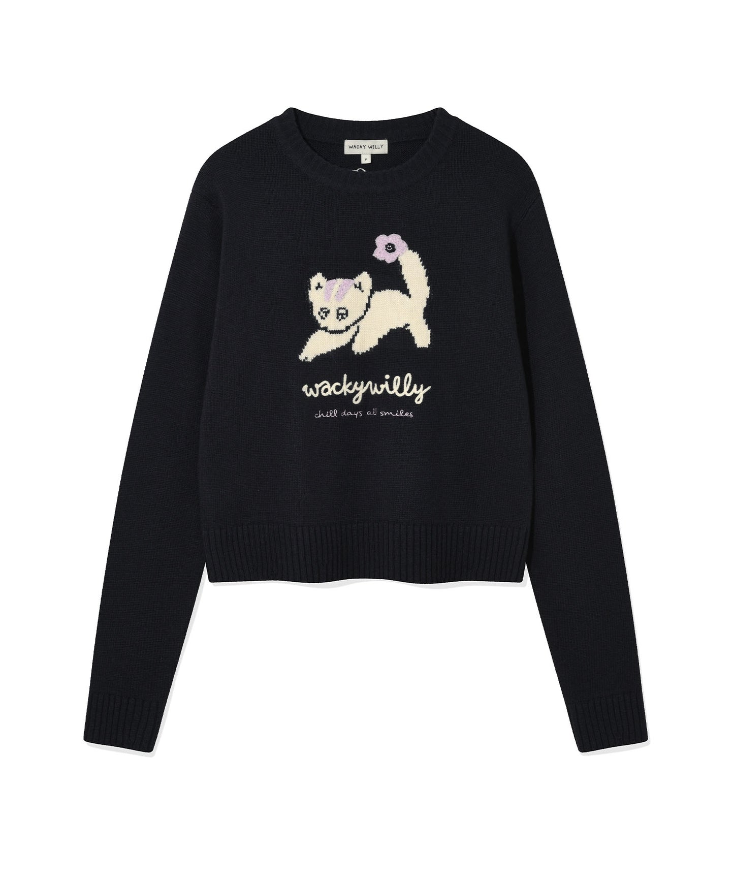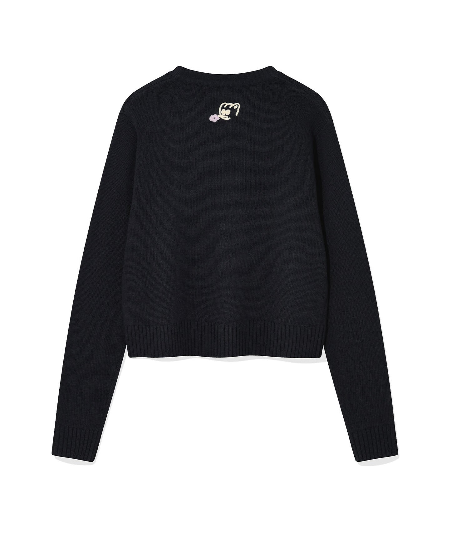Cream-colored sweater with embroidered cat design and text on a white background